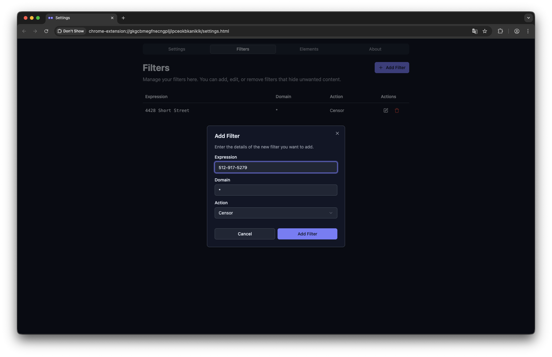 Install in minutes. Create simple rules to blur or hide emails, names, and other sensitive data across sites. Regex are supported.